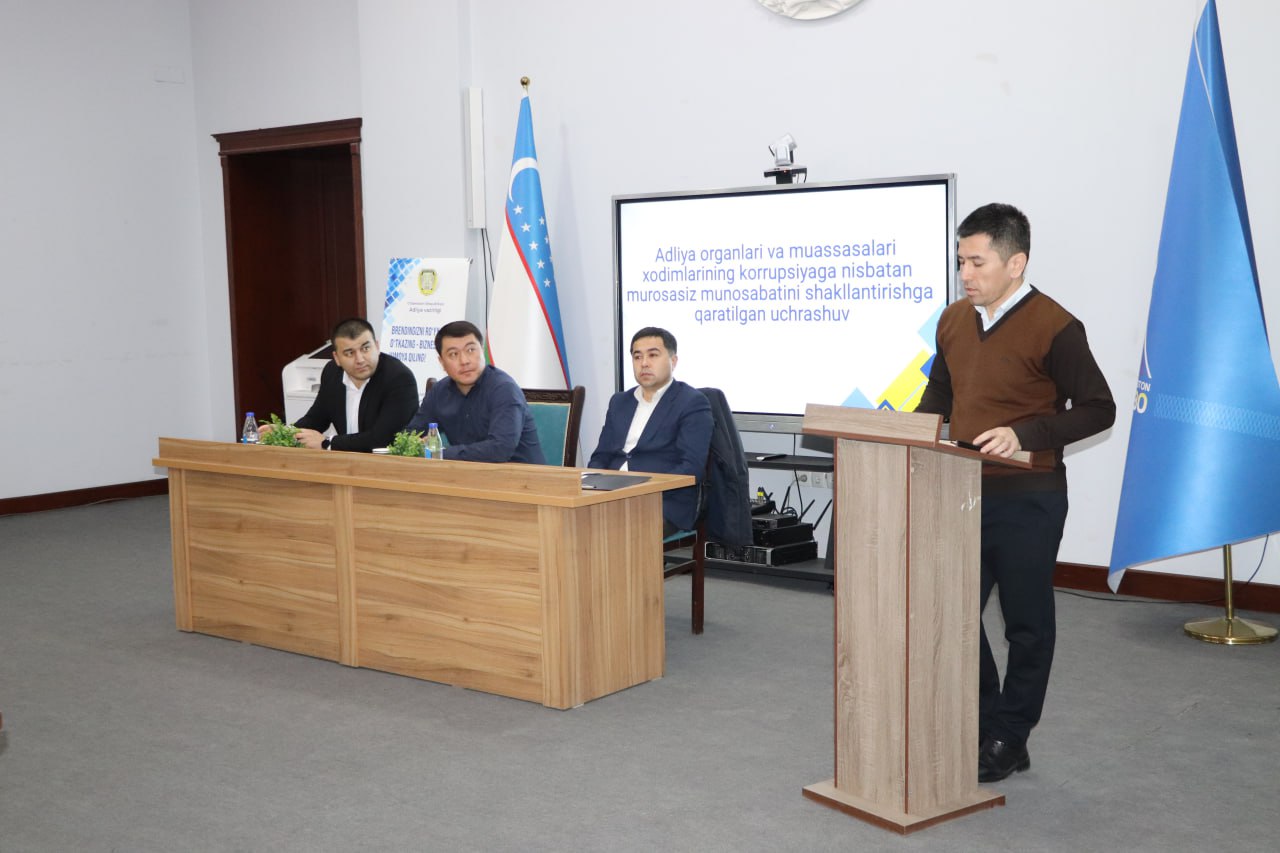 Adliya vazirligi hamda tegishli soha mutaxassislari ishtirokida “Korrupsiyaga qarshi kurashish barchamizning asosiy vazifamiz” mavzusida Toshkent shahar adliya boshqarmasida xodimlar ishtirokida tadbir tashkillashtirildi.