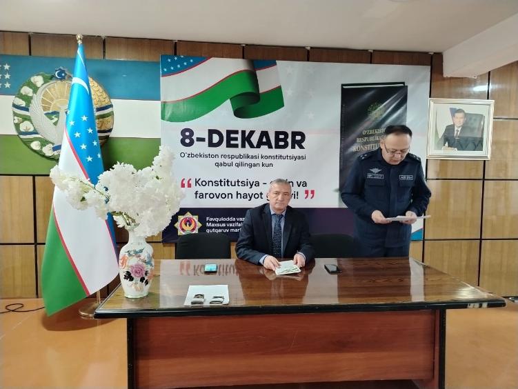 "Konstitutsiya - inson qadri, erkinlik, tenglik va adolat garovi!" shiori ostida navbatdagi tadbir O‘zbekiston Respublikasi Favqulodda vaziyatlar vazirligi Maxsus vazifalar bo‘yicha Respublika qutqaruv markazida o‘tkazildi.